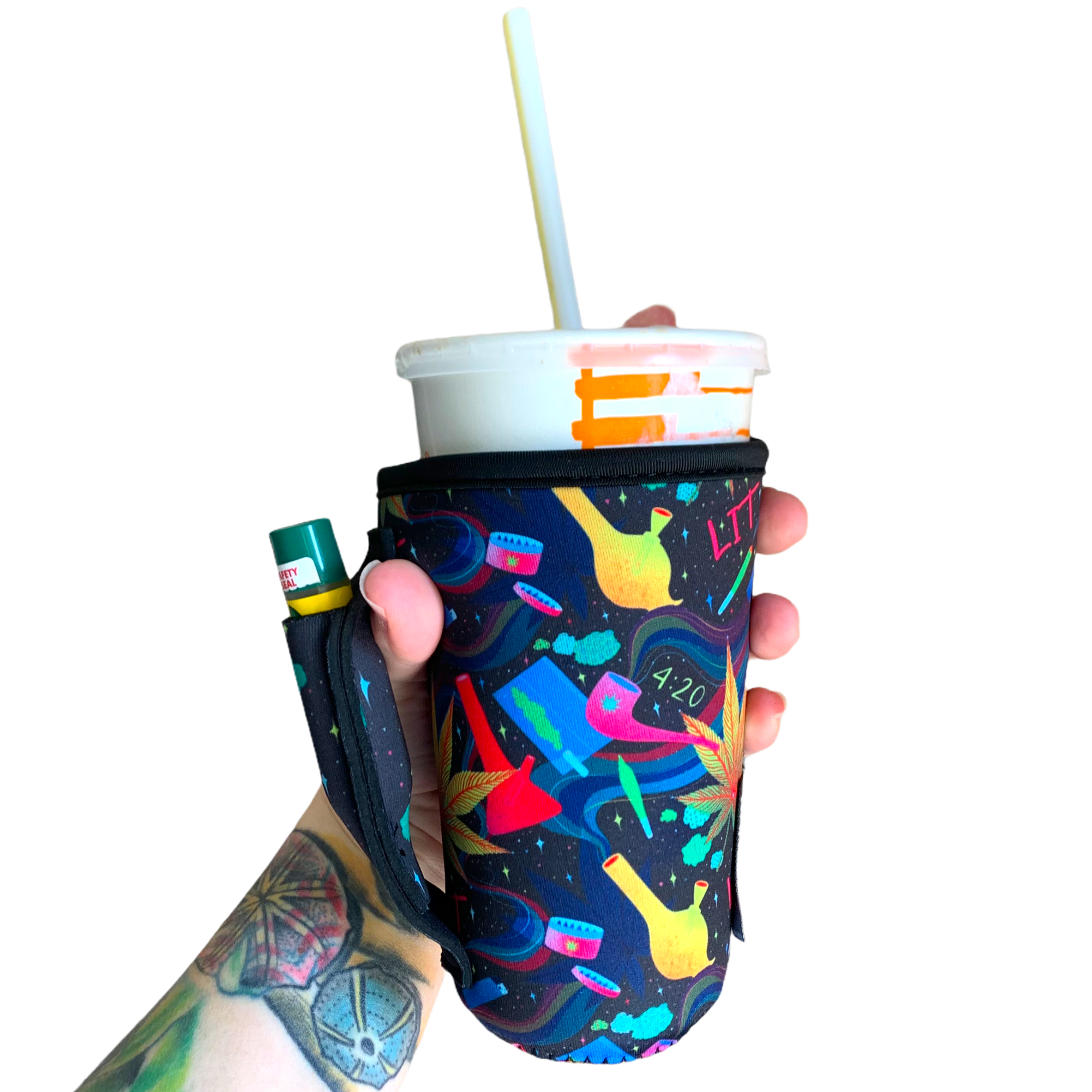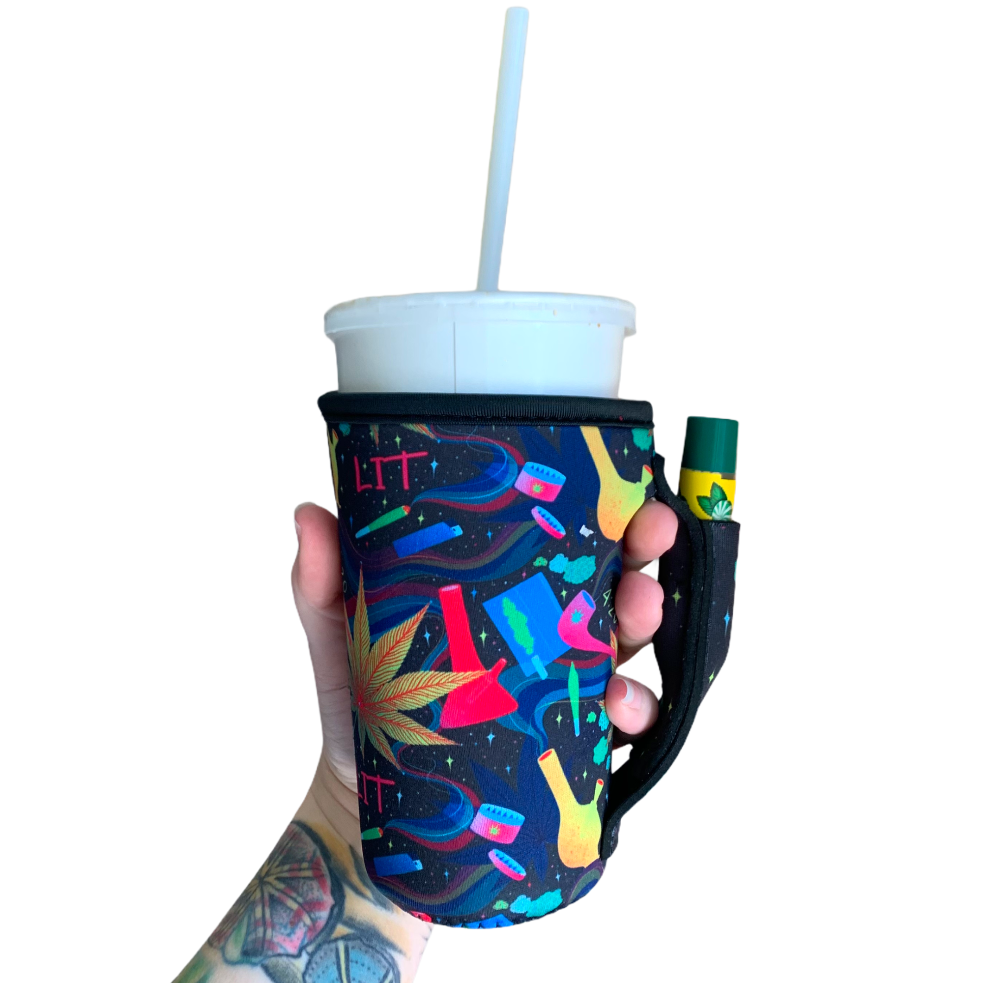 These patent pending Handlers™ are a little different than your average insulating sleeve. They have an easy to grip handle built right into the sleeve to help redistribute the weight. There is also an awesome pocket inside the reinforced handle to help keep your small essentials at bay. Easily slide your lip balm or other small essentials inside. These Handlers™ will help keep your drink cold/hot, your hands dry and you won't have to ask someone to "hold your drink" again!